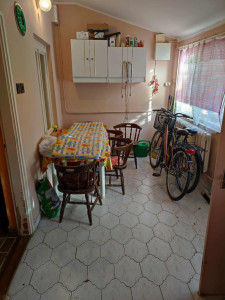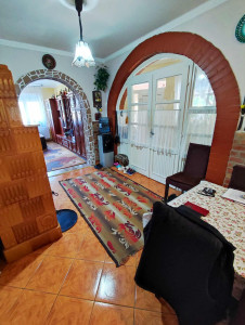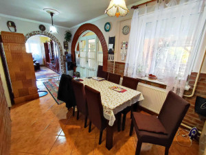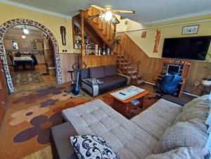 Alsó szinten van 1 nappali-25 m2, étkező-20 m2, konyha-8 m2 amiből nyilik egy 70m2 mellék épület 3 helyiségből álló, fürdőszoba-6m2 wc -4 m2 külön helyiségben, étkezőben 3 éve épitettek egy fa tüzelésű cserép kályhát.