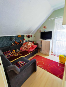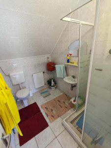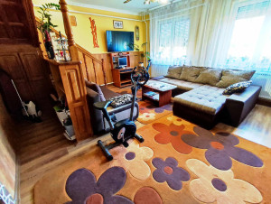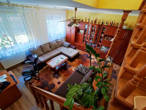 Felső szinten 4 szoba, 2 szobából ki lehet menni 2 erkélyre-2x8 m2, nappali-12 m2, fürdőszoba-wc egyben-10 m2.